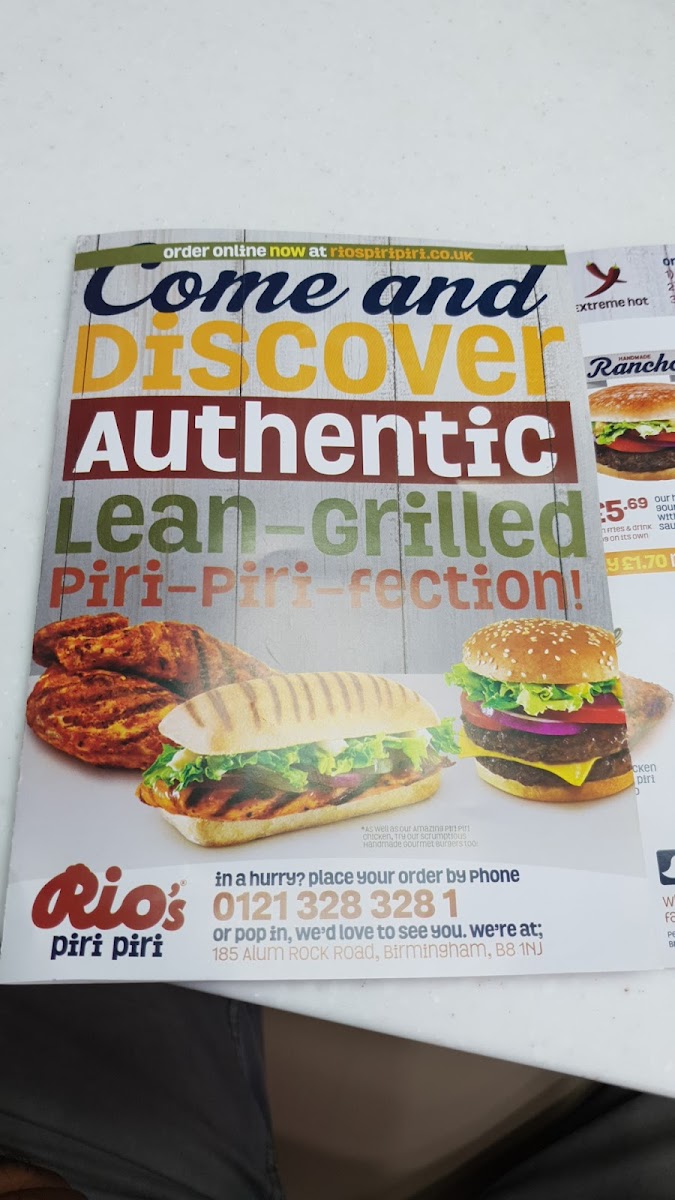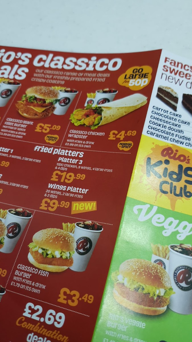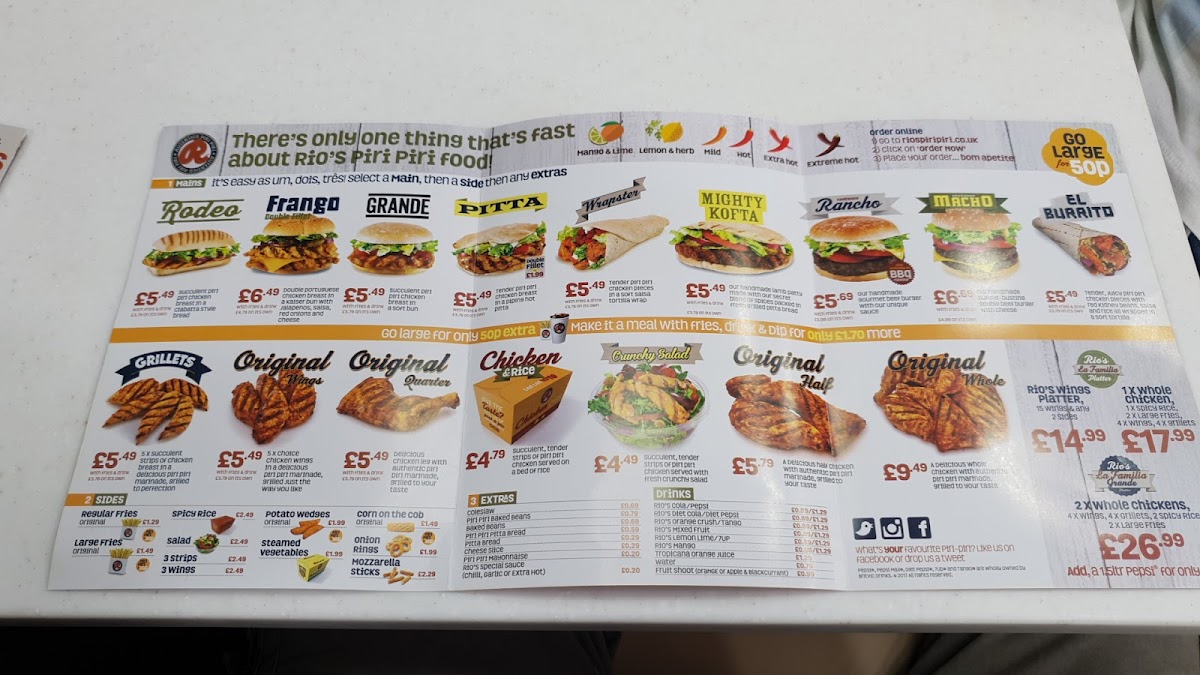The menu at Rio’s Piri Piri Alum Rock features a range of fast food options centered around chicken dishes and burgers. It is structured to cater to customers seeking quick and convenient meals, including grilled and fried chicken items, sandwiches, and burgers served with sides such as fries.